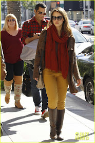 Whenever I am needing some casual style inspiration I can always look to Jessica Alba. I am obsessed with this look! I had never really thought of wearing mustard skinny jeans but I am kind of loving how it looks paired with a comfy tee, scarf, and sweater. Its a lot of color that works great in one outfit!