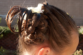 You should end up with to braids next to the right ear. Go ahead and cross one braid over the other and then pull the bottoms of the braids back up to the head.